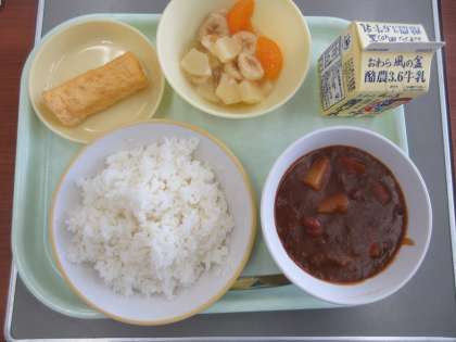 メニューは、ご飯、たべキリンハヤシ、たまごロール、フルーツミックス、牛乳でした。フルーツミックスに、「みかん・バナナ・パイン」の3種類と、たべキリンハヤシのルウの中に、隠し味のすりおろした「りんご」が入っていました。フルーツには、調子を整えたり、疲れをとったりするなど、体に良い働きがたくさんあります。おいしさもいっぱいでうれしかったですね。