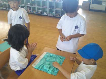 今日は、先日粘土でつくったごちそうを見合いました。「このお寿司は、なに?」「これは、何味のピザですか?」「いらっしゃいませ」「もうすぐ閉店です」…子供たちは、自然にレストランごっこ遊びを始めていました。友達の作品に興味・関心をもち、互いのよさを認め合う姿が素敵でした。