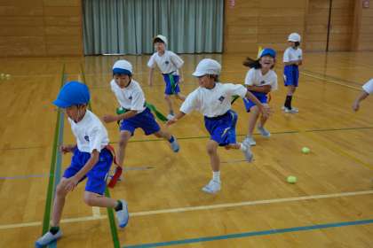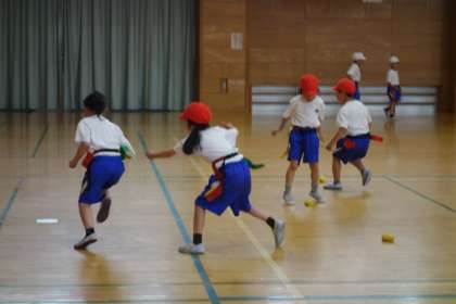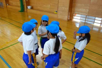 体育の学習の様子です。攻め方の作戦を決め、試してみました。