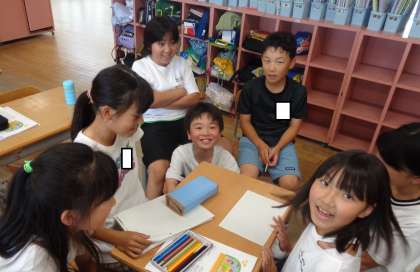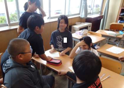 調理実習に向けて、班ごとに役割を話している様子です。次の家庭科の授業では青菜のおひたしとゆで卵を作ります。班の友達と協力してがんばります。