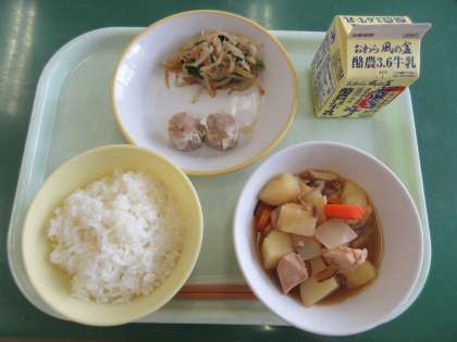メニューは、ご飯、肉シューマイ、香味和え、筑前炊き、牛乳でした。香りもよく、もりもり食べることができました。