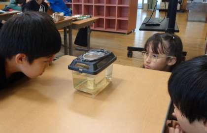理科の授業でメダカの赤ちゃんを観察している様子です。メダカの赤ちゃんの特徴を捉えて観察することができていました。