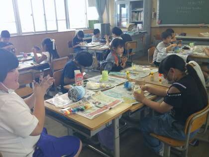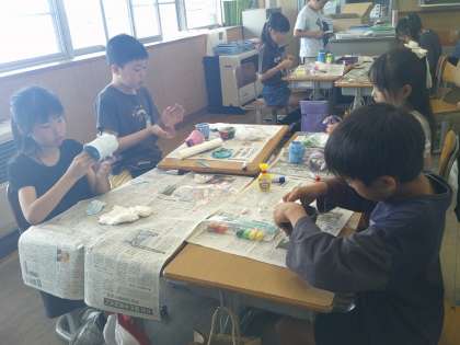 子供たちは、先週の学びを生かし、粘土に好きな色を付けてこねたり、容器にきれいにのばして付けたり、飾りを工夫したりしながら、意欲的に活動を進めていました。