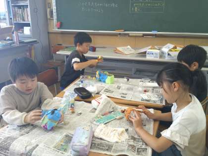 先週に引き続き、「空き容器のへんしん」の学習に取り組み、作品を仕上げました。