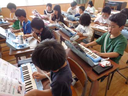 鍵盤ハーモニカでは、指くぐりと指またぎができているか、友達と確かめながら練習しました。