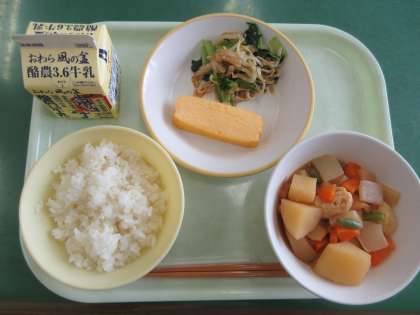 今日のメニューは、ご飯、厚焼き卵、小松菜のごま和え、関東炊き、牛乳でした。小松菜は、あくが少ないので、おひたしなどの和え物の他にも、炒め物や汁物などに使われます。また、骨を丈夫にするカルシウムや血液をつくるもとになる鉄分が多くふくまれています。栄養たっぷりの給食でした。