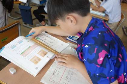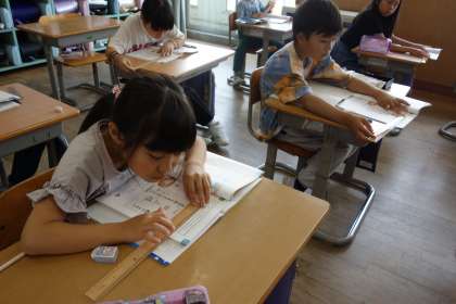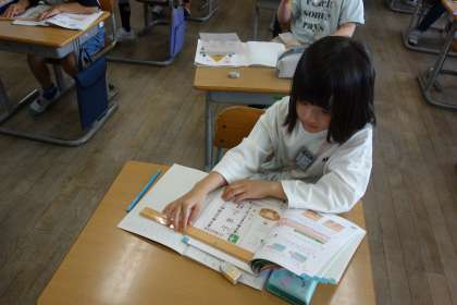 算数科の長さの学習の様子です。目盛りをよく見て、長さを測ります。細かい目盛りで、大変そうです。がんばれ!!
