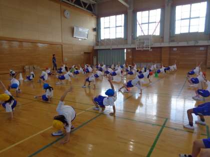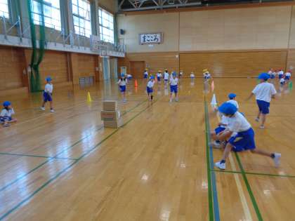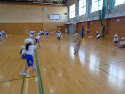 体育の学習では、お手玉を投げて段ボールを倒すゲームを行いました。的に向かって力強く投げることができました。