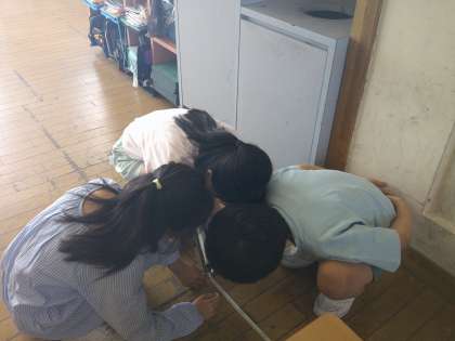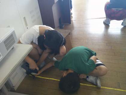 今日の算数では、巻き尺の目盛りの読み方を学習した後、教室の縦と横の長さを測定しました。子供たちは、グループの友達と役割分担をし、正しく測ろうと声をかけ合っていました。