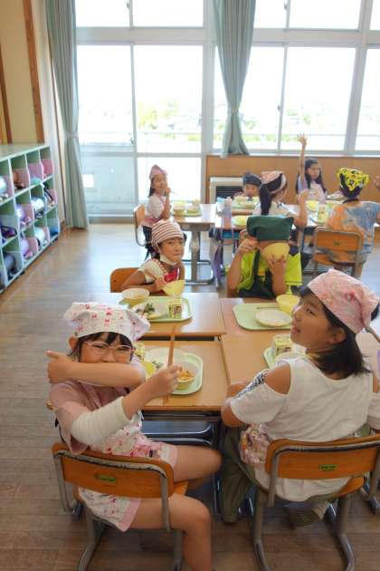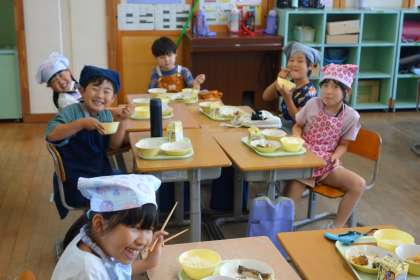 今日は5・6年生の宿泊学習のため、あおぞら級の2年生児童も一緒に給食を食べました。楽しくおいしくいただきました。