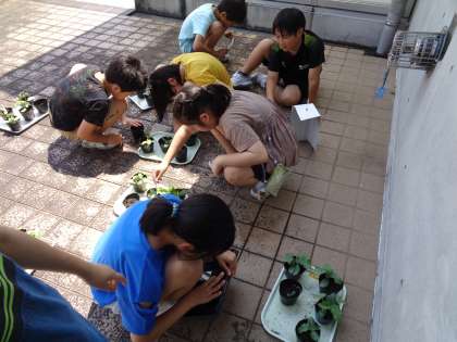 ヘチマが成長しています。葉の数が増え、くきが伸びてきました。そろそろ大きな鉢に植え替え予定です。