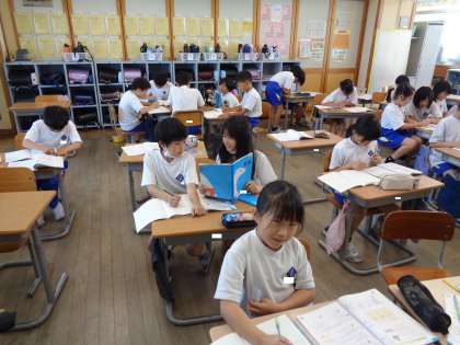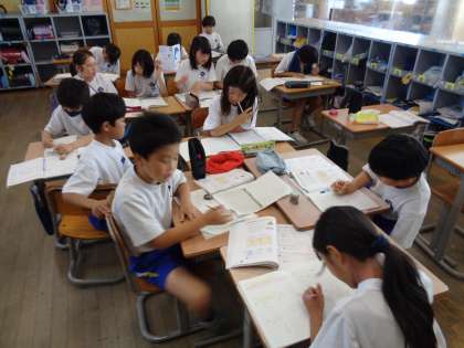 わり算の学習もまとめになりました。一人で黙々と問題を解く子供、友達と一緒に考える子供など、自分に合った学び方で進めています。