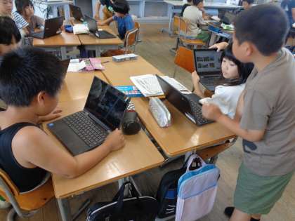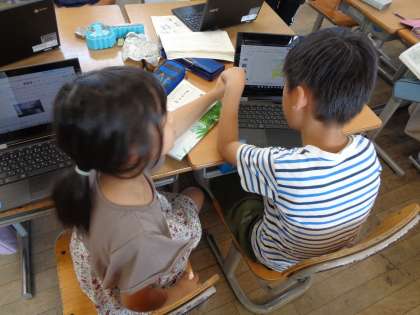 富山市のおすすめの場所をスライドにまとめています。友達と作成の仕方を教え合いながら進める姿が見られます。