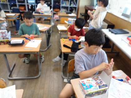 電流のはたらきについて学習しています。モーターを速く回す方法を実験キットを使って調べると、乾電池のつなぎ方や数が関係していることが分かりました。