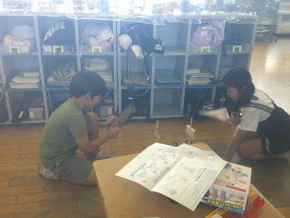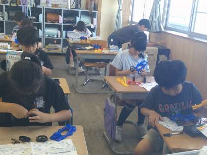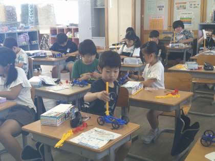 「風で車を走らせよう」の学習で使う車を組み立てました。