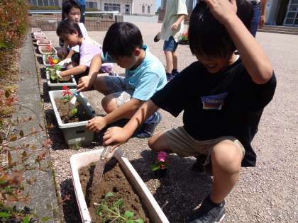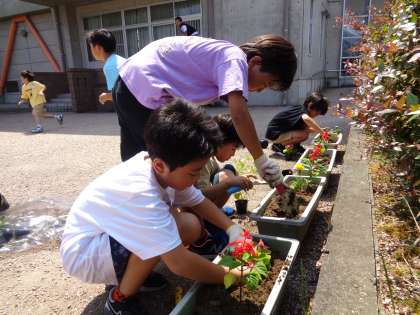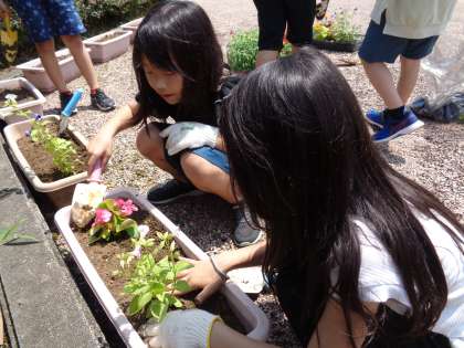 「花苗植えボランティア募集します」の声かけに、進んで参加するすてきな子供たちです。夢中になってたくさんのプランターに花苗を植えました。
