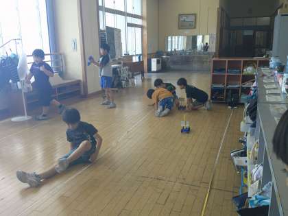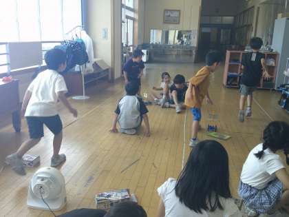 今日は、送風機を使って風の強さを変え、車の動きを調べました。