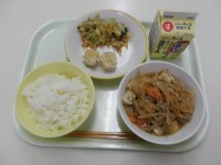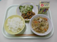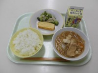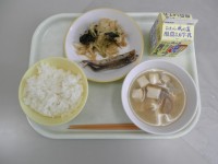 メニューは、ご飯、厚揚げの肉味噌がけ、磯和え、味噌汁、牛乳です。