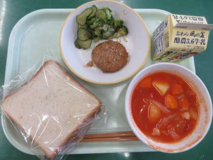 メニューは、食パン、チキンハンバーグ、グリーンサラダ、野菜とソーセージのトマト煮、牛乳でした。トマトは、スーパーなどでは1年中見かけますが、夏が旬の野菜です。ビタミンAやビタミンCなど、ビタミンを豊富に含んでいます。また、トマトの栄養素として注目したいのは、「リコピン」です。リコピンは、がんや動脈硬化などの病気を予防します。今日は、トマトの味を生かした煮込み料理です。外国には、「トマトが好きな家庭に、医者はいらない」ということわざもあるほどです。