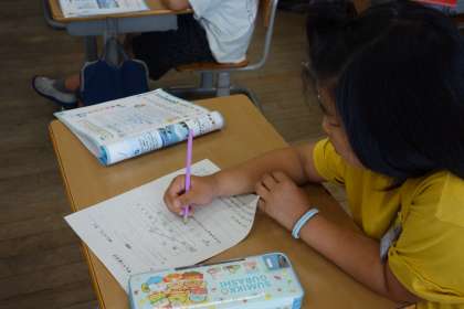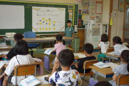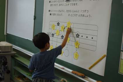 音楽科の学習の様子です。昨年度から馴染みのある「ぷっかりくじら」の曲を用いて、旋律づくりに取り組みました。