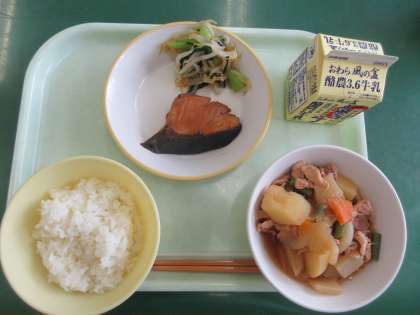 メニューは、ご飯、ふくらぎの照焼き、甘酢和え、豚肉とじゃがいものうま煮、牛乳でした。豚肉には、丈夫な体をつくるために必要なたんぱく質やエネルギーのもとになる脂質が含まれています。また、ビタミンB1が多いのが特徴です。ビタミンB1は、ごはん等に多く含まれているでんぷんをエネルギーに変える働きがあり、疲れた体を元気にしてくれます。宮野っ子は今日も元気に活動しています。