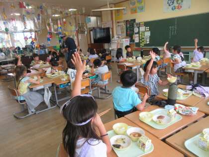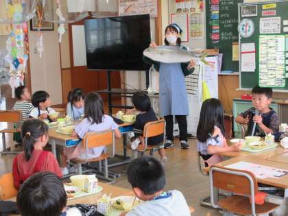 子供たちは、ふくらぎとぶりについてのお話を聞きました。魚の栄養のすごさを知った後、たくさんの子供たちがおかわりの手を挙げていました。