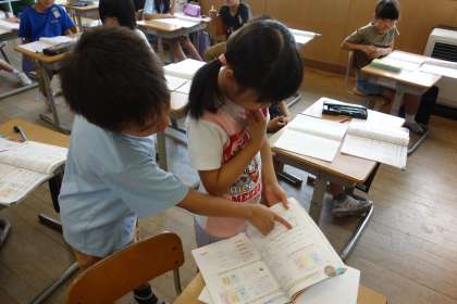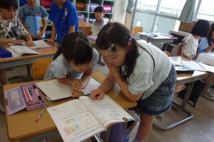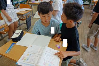 必要に応じて教え合いながら学習を進めています。教える側も、アウトプットすることで確かな学びになっていきます。