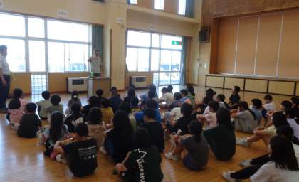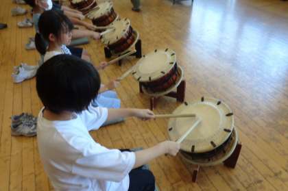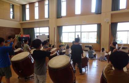 良鳴先生による初回の太鼓指導でした。太鼓の叩き方の基礎から教えていただき、子どもたちも集中して話を聴き実践しているようでした。これは、「大地」チームの様子です。