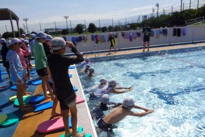 今日も良い天気の中、プール学習を行いました。お手本の児童の泳ぎを見た他の児童は「速い!」「どうやったら速く泳げるようになるかな」などと感想をもち、子どもたち同士で能力を高め合っている様子でした。