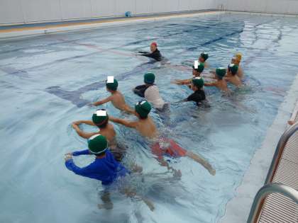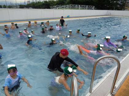 今日は、水泳教室がありました。泳ぐ時の手の動かし方を練習したり、プールに入って実際に泳いでみたり、楽しんでいました。