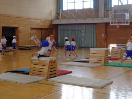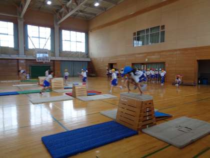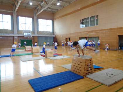 踏み切りや手を着く位置に気を付けて練習をしました。開脚跳び、閉脚跳び、抱え込み跳び、台上前転等、自分が挑戦したい跳び方に進んで取り組んでいました。