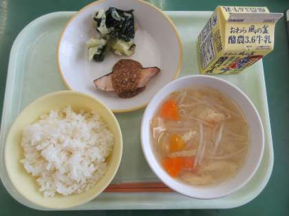メニューは、ご飯、魚のごまだれかけ、酢の物、味噌汁、牛乳でした。