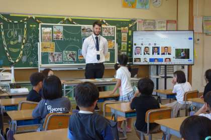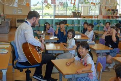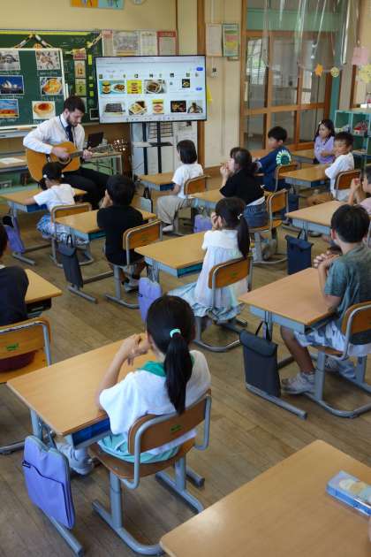 外国語の先生と楽しく学習しました。得意のギターも披露してくださり、笑顔の子供たちでした。