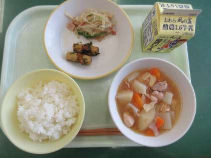 メニューは、ご飯、ちくわの磯煮、はりはりソテー、鶏肉とじゃがいもの南蛮煮、牛乳でした。切り干し大根は、生の大根に比べ食物繊維は約15倍にもなります。食物繊維は、腸内の善玉菌を増やしたり、腸内を掃除してくれる大事な栄養素です。また、切り干し大根ははかみごたえがあり、 かむことで脳が刺激され、頭の働きがよくなるそうです。いいことづくしの食材ですね。