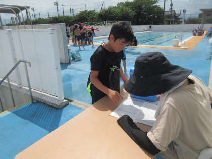 学校のプールでは、子供たちが楽しそうに泳ぎの練習をしたり、水に親しんだりしています。夏休みを思い切り楽しんでいますね。保護者の皆様、当番活動にご協力いただき、感謝いたします。