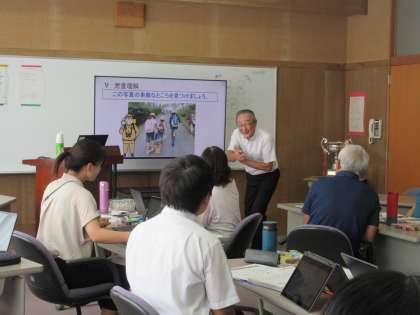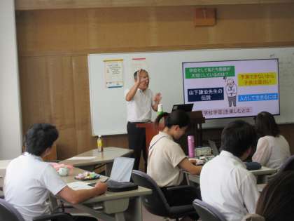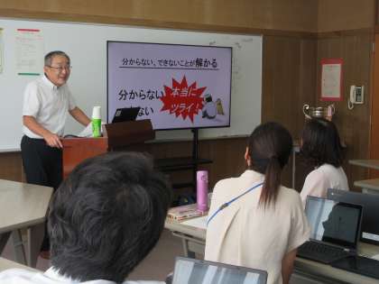 もうすぐ始まる2学期に向けて、教員は主体的に学んでいます。今日の研修会では、大先輩である飯野義明先生が豊かなご経験を交えながら、教育にとって大切なことや忘れててはいけないことをユーモアを交えて熱く、分かりやすく教えてくださいました。元気と勇気、やる気をこれからに生かしていきます。