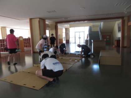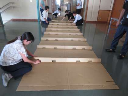 避難所開設・運営訓練で使用した段ボールベッドやパーティションを配置しました。実物で体感してみましょう。