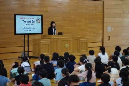 「失敗をおそれずにやってみよう」「分からないときは、自分から教えてと言えるようになろう」「できない理由を考えるより、できる方法を考えよう」等と、校長先生より前向きなメッセージを受け取った子供たち。たくさんトライして、自分を磨いていきましょう。