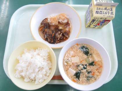 2学期最初の給食は、ご飯、にんじんシューマイ、もずくのチャプチェ、かき玉汁、牛乳でした。ふわふわの卵がとてもきれいです。