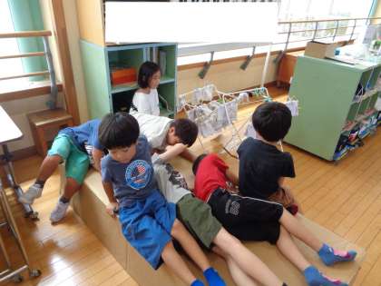避難所開設訓練の時に作った段ボールベッドが学年フロアに設置されました。休み時間、そこに集まった子供たちは座ったり寝転がったりして段ボールベッドを体験していました。