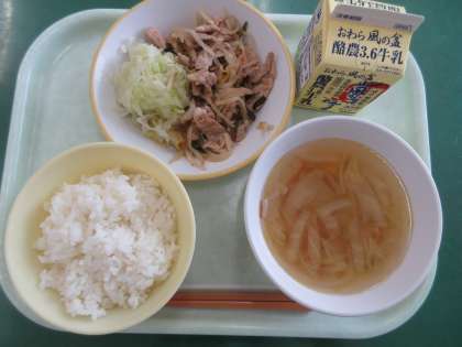 メニューは、豚キムチ丼、ゆでキャベツ、白菜スープ、牛乳でした。たっぷりの豚肉はボリューミーで、食べ応えがありました。あっさりとした白菜スープがもとてもおいしかったです。
