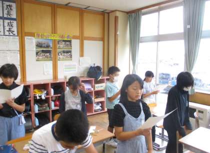 朝の会で、全校みんなで歌を歌っています。 5年生のみんなも元気に歌っています。