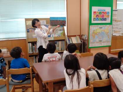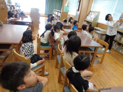 図書室で、読み聞かせを行いました。真剣に聞く子供たちです。