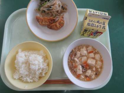 メニューは、ご飯、揚げ餃子、塩ナムル、麻婆豆腐、牛乳でした。麻婆豆腐の中にはたくさんの隠し味が入っていて、とても奥深いです。中華メニューもとてもおいしかったです。