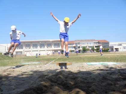 ソフトボール投げと走り幅跳びの練習を行いました。子供たちは目標を決め、目標の記録を超えられるように取り組んでいました。投げ方や跳び方を互いに教え合う姿が見られました。