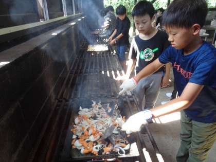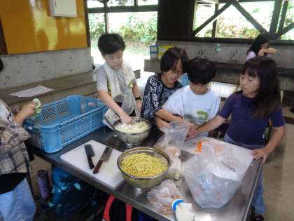 2日目は野外炊飯をしました。班のみんなで協力して、やきそばを作りました。おいしいやきそばをお腹いっぱいに食べて、笑顔が広がりました。