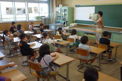 朝の読み聞かせの時間の様子です。スイミーの作者でもある、レオ・レオニ作の絵本の読み聞かせをしていただきました。