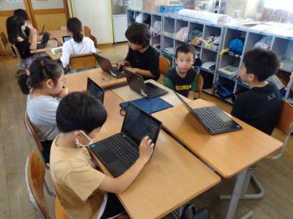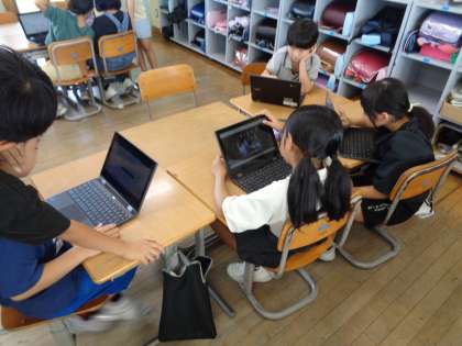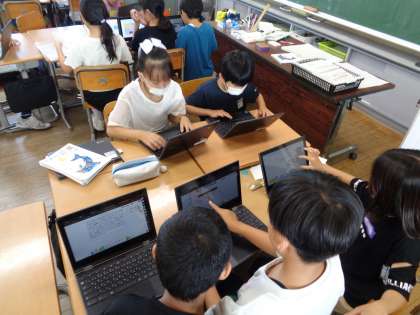 宿泊学習で学んだこと、考えたことなどを新聞にまとめています。文字や写真の大きさを工夫したり、割り付けを話し合ったりしながら、班で協力して進めています。