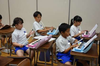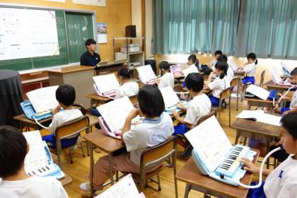 拍に合わせて、演奏を楽しみました。教育実習生の先生と協力して、上手に山のポルカを演奏できました。