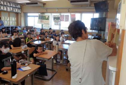 保護者ボランティアの方に、読み聞かせをしていただきました。読み聞かせの前に、本の内容に関連する話を少しされ、子供たちの興味を引きつけてから読み聞かせをされました。